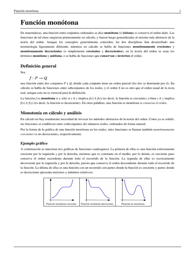 La funcin f es montona si y slo si x y implica f(x) f(y) (es decir, la funcin es creciente), o bien x y implica