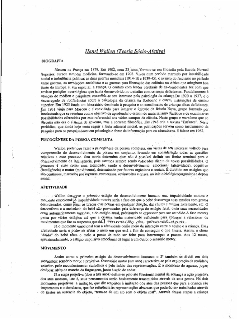 Das idias explicitadas por Wallon, destaca-se a que se refere necessidade de superao da
