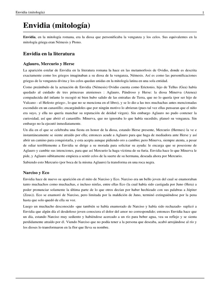 Envidia, en la mitologa romana, era la diosa que personificaba la venganza y los celos. Sus equivalentes en la