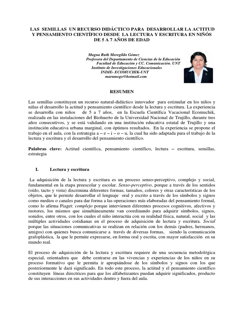 El pensamiento cientfico tiene como propsito explicar los acontecimientos, hechos, o relaciones que surgen en la vida cotidiana, mediante la objetividad, racionalidad y sistematicidad. La objetividad caracterizada por partir de los hechos concretos y reales, sin mezclar los instintos o sentimientos del que investiga. La racionalidad, entendida como la posibilidad de articular ideas, conceptos, leyes para que posteriormente se traduzca a teoras y la sistematicidad como la posibilidad de entender la armona entre el objeto y los conceptos. Consideramos que la lectura y la escritura, constituyen un proceso investigativo, por ende estimulador de la actitud y el pensamiento cientfico, porque ofrece un mundo de posibilidades atractivos y motivadores a travs de los cuales, los nios desarrollan capacidades de curiosidad, indagacin, exploracin, experimentacin, problematizacin, infieren, deducen, analizan, sistematizan entre otras. La experiencia desarrollada con nios de 5 a 7 aos, en la Escuela Cientfica Vacacional Ecomuchik, realizada en las instalaciones del Biohuerto de la Universidad Nacional de Trujillo, durante tres aos consecutivos, los cuales han dado exitosos frutos en el campo de la lectura y escritura, trabajado con semillas como principal recurso natural y del contexto, estos resultados nos permite afirmar que es posible desarrollar la actitud y pensamiento cientfico. La experiencia se desarroll empleando la estrategia a-e-i-o-u, propuesta por Snchez Pelez, H. y adaptada por la autora, especficamente para esta experiencia.