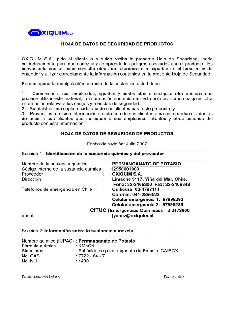 OXIQUIM S.A., pide al cliente o a quien reciba la presente Hoja de Seguridad, leerla