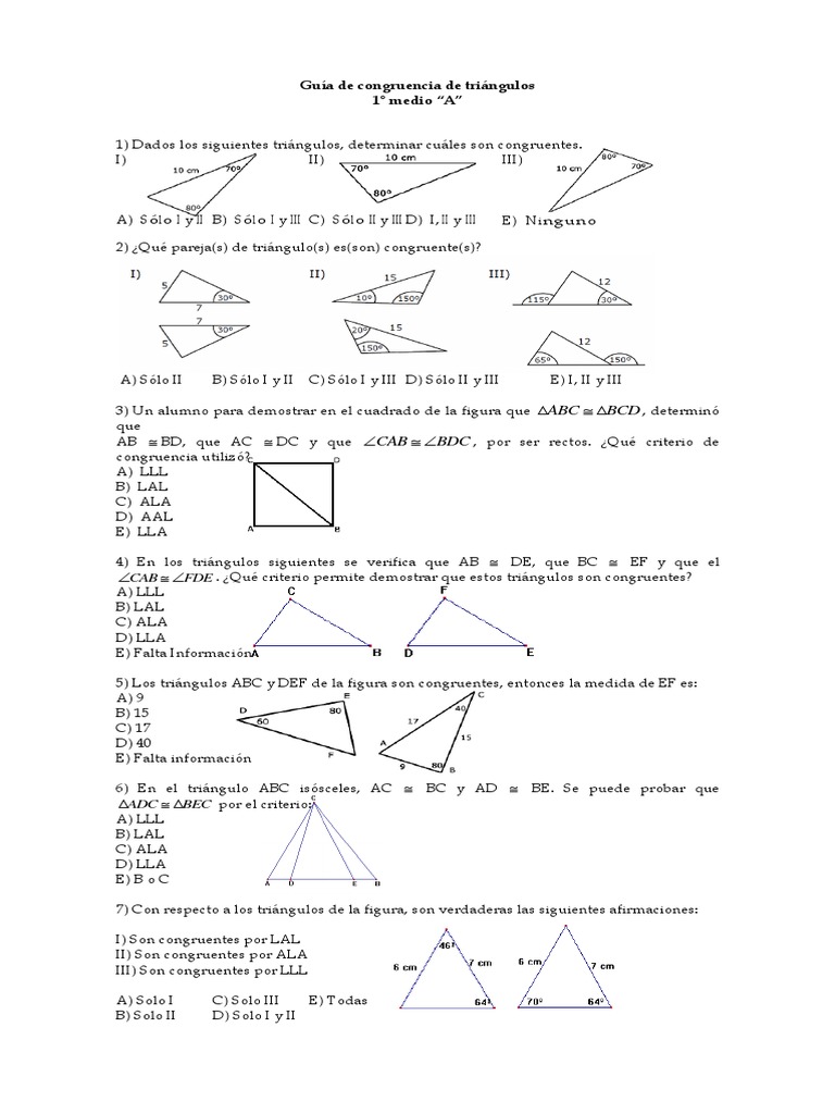 1) Dados los siguientes tringulos, determinar cules son congruentes.