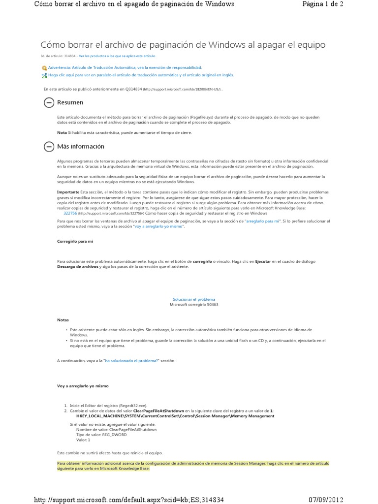 Este artculo documenta el mtodo para borrar el archivo de paginacin (Pagefile.sys) durante el proceso de apagado, de modo que no queden