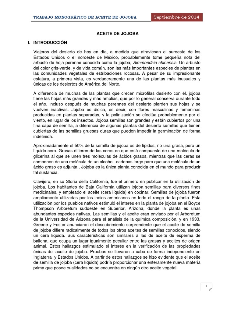 TRABAJO MONOGRFICO DE ACEITE DE JOJOBA Septiembre de 2014