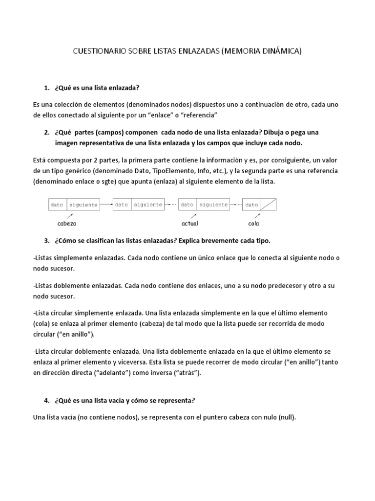 CUESTIONARIO SOBRE LISTAS ENLAZADAS (MEMORIA DINMICA)