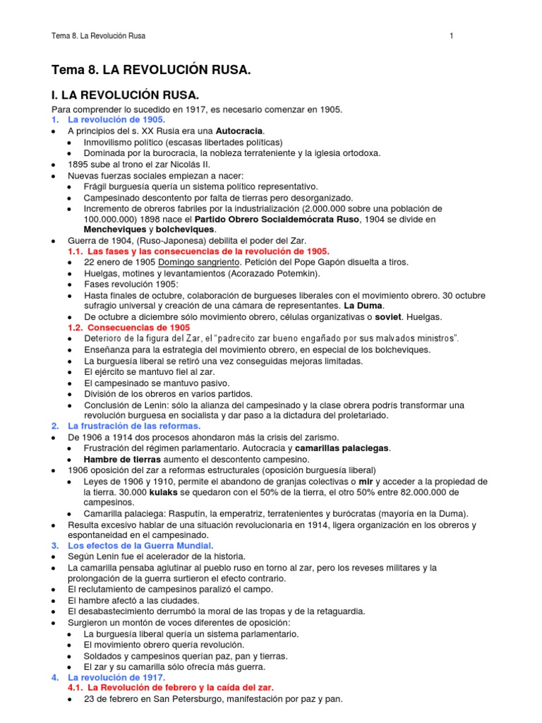 I. LA REVOLUCIÓN RUSA. Para comprender lo sucedido en 1917, es necesario comenzar en 1905. 1. La revolución de 1905. A principios del s. XX Rusia era una Autocracia. Inmovilismo político (escasas libertades políticas) Dominada por la burocracia, la nobleza terrateniente y la iglesia ortodoxa. 1895 sube al trono el zar Nicolás II. Nuevas fuerzas sociales empiezan a nacer: Frágil burguesía quería un sistema político representativo. Campesinado descontento por falta de tierras pero desorganizado. Incremento de obreros fabriles por la industrialización (2.000.000 sobre una población de 100.000.000) 1898 nace el Partido Obrero Socialdemócrata Ruso, 1904 se divide en Mencheviques y bolcheviques. Guerra de 1904, (Ruso-Japonesa) debilita el poder del Zar. 1.1. Las fases y las consecuencias de la revolución de 1905. 22 enero de 1905 Domingo sangriento. Petición del Pope Gapón disuelta a tiros. Huelgas, motines y levantamientos (Acorazado Potemkin). Fases revolución 1905: Hasta finales de octubre, colaboración de burgueses liberales con el movimiento obrero. 30 octubre sufragio universal y creación de una cámara de representantes. La Duma. De octubre a diciembre sólo movimiento obrero, células organizativas o soviet. Huelgas. 1.2. Consecuencias de 1905 Deterioro de la figura del Zar, el “padrecito zar bueno engañado por sus malvados ministros”. Enseñanza para la estrategia del movimiento obrero, en especial de los bolcheviques. La burguesía liberal se retiró una vez conseguidas mejoras limitadas. El ejército se mantuvo fiel al zar. El campesinado se mantuvo pasivo. División de los obreros en varios partidos. Conclusión de Lenin: sólo la alianza del campesinado y la clase obrera podrís transformar una revolución burguesa en socialista y dar paso a la dictadura del proletariado. 2. La frustración de las reformas. De 1906 a 1914 dos procesos ahondaron más la crisis del zarismo. Frustración del régimen parlamentario. Autocracia y camarillas palaciegas. Hambre de tierras aumento el descontento campesino. 1906 oposición del zar a reformas estructurales (oposición burguesía liberal) Leyes de 1906 y 1910, permite el abandono de granjas colectivas o mir y acceder a la propiedad de la tierra. 30.000 kulaks se quedaron con el 50% de la tierra, el otro 50% entre 82.000.000 de campesinos. Camarilla palaciega: Rasputín, la emperatriz, terratenientes y burócratas (mayoría en la Duma). Resulta excesivo hablar de una situación revolucionaria en 1914, ligera organización en los obreros y espontaneidad en el campesinado. 3. Los efectos de la Guerra Mundial. Según Lenin fue el acelerador de la historia. La camarilla pensaba aglutinar al pueblo ruso en torno al zar, pero los reveses militares y la prolongación de la guerra surtieron el efecto contrario. El reclutamiento de campesinos paralizó el campo. El hambre afectó a las ciudades. El desabastecimiento derrumbó la moral de las tropas y de la retaguardia. Surgieron un montón de voces diferentes de oposición: La burguesía liberal quería un sistema parlamentario. El movimiento obrero quería revolución. Soldados y campesinos querían paz, pan y tierras. El zar y su camarilla sólo ofrecía más guerra. 4. La revolución de 1917. 4.1. La Revolución de febrero y la caída del zar. 23 de febrero en San Petersburgo, manifestación por paz y pan. Tema 8. La Revolución Rusa 2