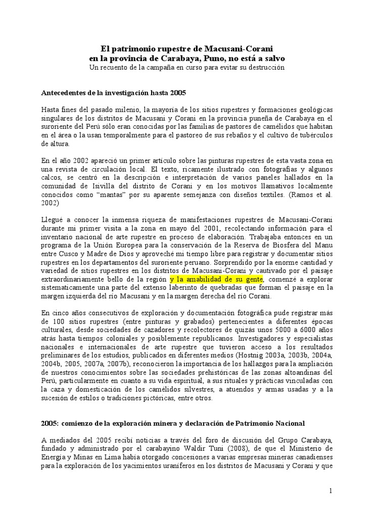Patrimonio Cultural de la Nacin a los sitios rupestres de Macusani-Corani, pareca correr la