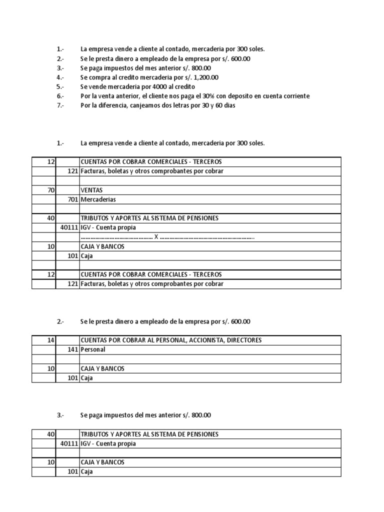 1.- La empresa vende a cliente al contado, mercaderia por 300 soles.