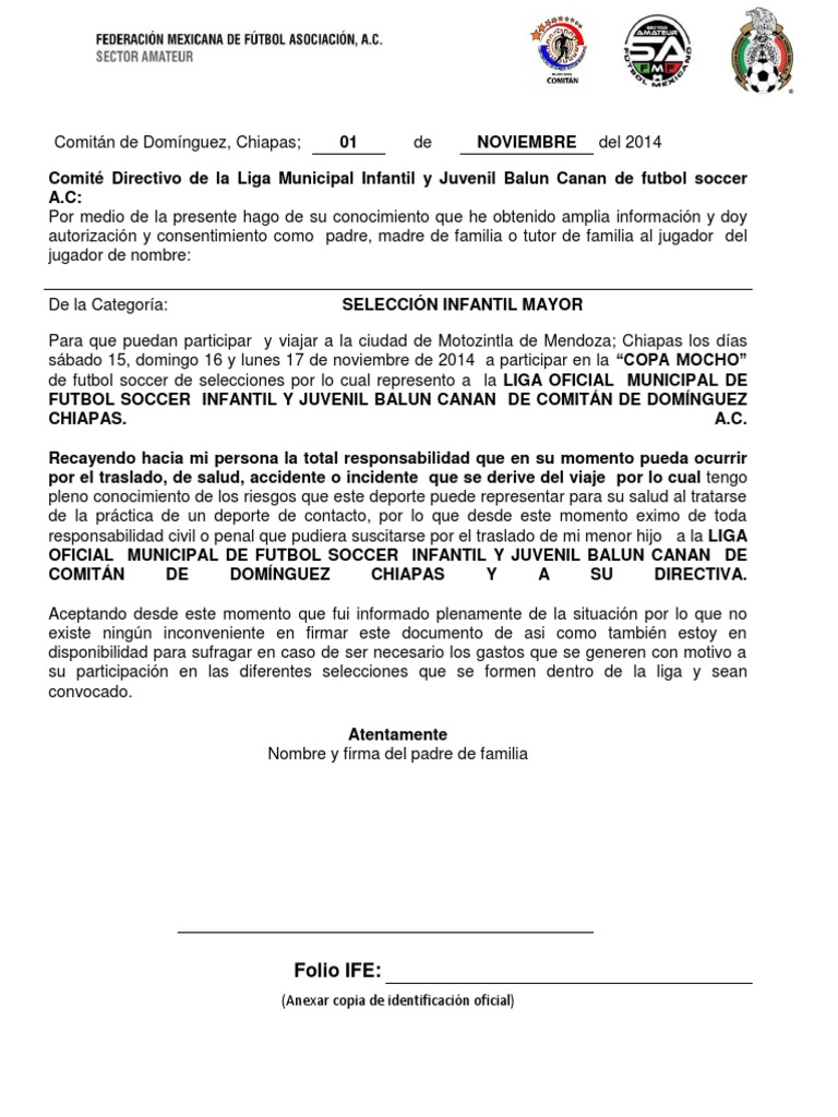 autorizacin y consentimiento como padre, madre de familia o tutor de familia al jugador del