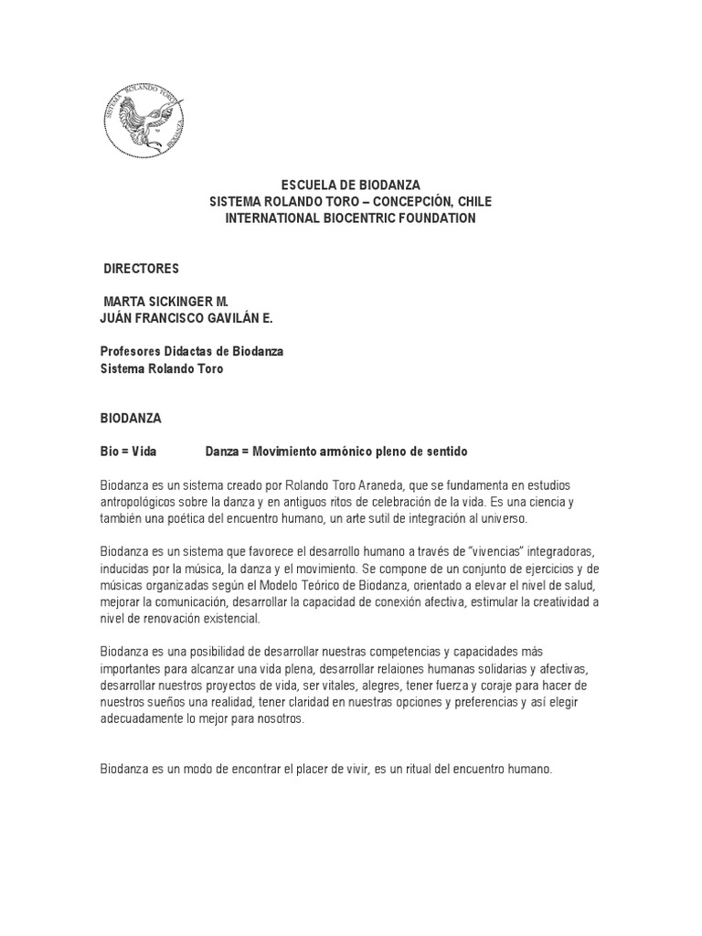 Biodanza es un sistema creado por Rolando Toro Araneda, que se fundamenta en estudios