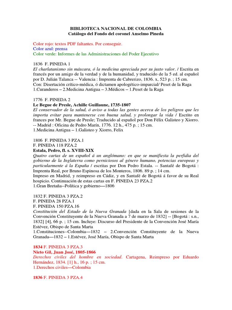 Catlogo del Fondo del coronel Anselmo Pineda