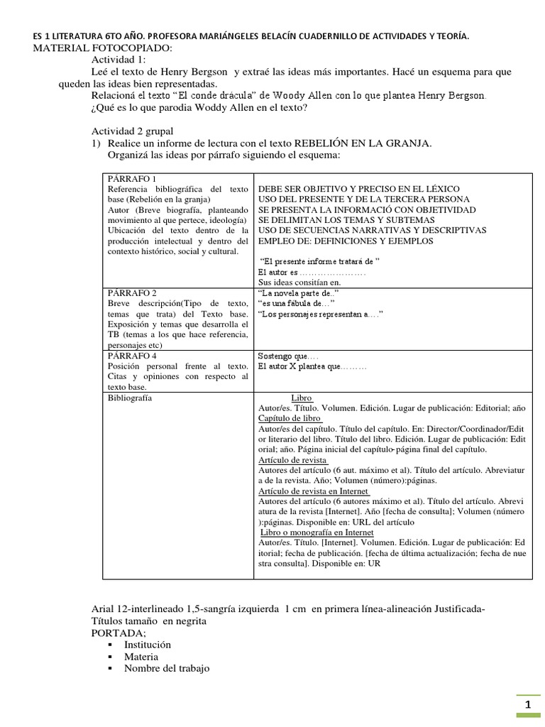ES 1 LITERATURA 6TO AO. PROFESORA MARINGELES BELACN CUADERNILLO DE ACTIVIDADES Y TEORA.