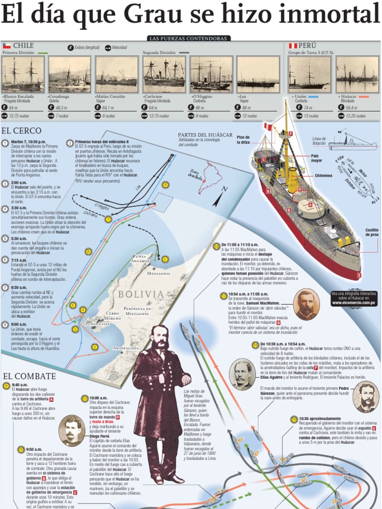 Fuente: “Historia Marítima del Perú” Tomo XI Vol.2 del Almirante Melitón Carvajal Pareja/ Gran Historia del Perú El Comercio-Grupo Carsa MAQUETA DEL HUASCAR: Antonio Tarazona/ INFOGRFÍA: Rems Miranda