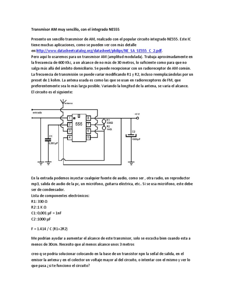 Presento un sencillo transmisor de AM, realizado con el popular circuito integrado NE555. Este IC