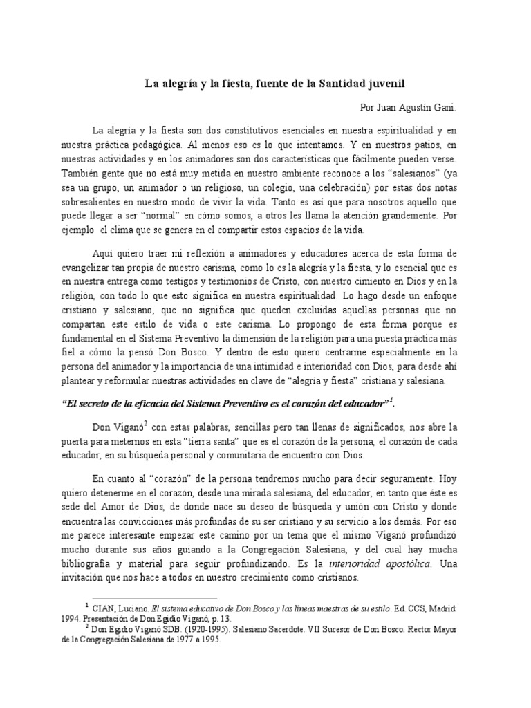 La alegra y la fiesta son dos constitutivos esenciales en nuestra espiritualidad y en nuestra prctica pedaggica. Al menos eso es lo que intentamos. Y en nuestros patios, en nuestras actividades y en los animadores son dos caractersticas que fcilmente pueden verse. Tambin gente que no est muy metida en nuestro ambiente reconoce a los salesianos (ya sea un grupo, un animador o un religioso, un colegio, una celebracin) por estas dos notas sobresalientes en nuestro modo de vivir la vida. Tanto es as que para nosotros aquello que puede llegar a ser normal en cmo somos, a otros les llama la atencin grandemente. Por ejemplo el clima que se genera en el compartir estos espacios de la vida. Aqu quiero traer mi reflexin a animadores y educadores acerca de esta forma de evangelizar tan propia de nuestro carisma, como lo es la alegra y la fiesta, y lo esencial que es en nuestra entrega como testigos y testimonios de Cristo, con nuestro cimiento en Dios y en la religin, con todo lo que esto significa en nuestra espiritualidad. Lo hago desde un enfoque cristiano y salesiano, que no significa que queden excluidas aquellas personas que no compartan este estilo de vida o este carisma. Lo propongo de esta forma porque es fundamental en el Sistema Preventivo la dimensin de la religin para una puesta prctica ms fiel a cmo la pens Don Bosco. Y dentro de esto quiero centrarme especialmente en la persona del animador y la importancia de una intimidad e interioridad con Dios, para desde ah plantear y reformular nuestras actividades en clave de alegra y fiesta cristiana y salesiana. El secreto de la eficacia del Sistema Preventivo es el corazn del educador 1 . Don Vigan 2 con estas palabras, sencillas pero tan llenas de significados, nos abre la puerta para meternos en esta tierra santa que es el corazn de la persona, el corazn de cada educador, en su bsqueda personal y comunitaria de encuentro con Dios. En cuanto al corazn de la persona tendremos mucho para decir seguramente. Hoy quiero detenerme en el corazn, desde una mirada salesiana, del educador, en tanto que ste es sede del Amor de Dios, de donde nace su deseo de bsqueda y unin con Cristo y donde encuentra las convicciones ms profundas de su ser cristiano y su servicio a los dems. Por eso me parece interesante empezar este camino por un tema que el mismo Vigan profundiz mucho durante sus aos guiando a la Congregacin Salesiana, y del cual hay mucha bibliografa y material para seguir profundizando. Es la interioridad apostlica. Una invitacin que nos hace a todos en nuestro crecimiento como cristianos.