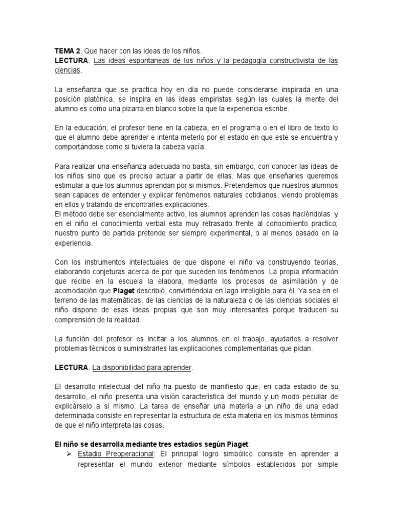 ciencias. La enseanza que se practica hoy en da no puede considerarse inspirada en una posicin platnica, se inspira en las ideas empiristas segn las cuales la mente del alumno es como una pizarra en blanco sobre la que la experiencia escribe. En la educacin, el profesor tiene en la cabeza, en el programa o en el libro de texto lo que el alumno debe aprender e intenta meterlo por el estado en que este se encuentra y comportndose como si tuviera la cabeza vaca. Para realizar una enseanza adecuada no basta, sin embargo, con conocer las ideas de los nios sino que es preciso actuar a partir de ellas. Mas que ensearles queremos estimular a que los alumnos aprendan por si mismos. Pretendemos que nuestros alumnos sean capaces de entender y explicar fenmenos naturales cotidianos, viendo problemas en ellos y tratando de encontrarles explicaciones. El mtodo debe ser esencialmente activo, los alumnos aprenden las cosas hacindolas y en el nio el conocimiento verbal esta muy retrasado frente al conocimiento practico; nuestro punto de partida pretende ser siempre experimental, o al menos basado en la experiencia. Con los instrumentos intelectuales de que dispone el nio va construyendo teoras, elaborando conjeturas acerca de por que suceden los fenmenos. La propia informacin que recibe en la escuela la elabora, mediante los procesos de asimilacin y de acomodacin que Piaget describi, convirtindola en lago inteligible para l. Ya sea en el terreno de las matemticas, de las ciencias de la naturaleza o de las ciencias sociales el nio dispone de esas ideas propias que son muy interesantes porque traducen su comprensin de la realidad. La funcin del profesor es incitar a los alumnos en el trabajo, ayudarles a resolver problemas tcnicos o suministrarles las explicaciones complementarias que pidan. LECTURA. La disponibilidad para aprender. El desarrollo intelectual del nio ha puesto de manifiesto que, en cada estadio de su desarrollo, el nio presenta una visin caracterstica del mundo y un modo peculiar de explicrselo a si mismo. La tarea de ensear una materia a un nio de una edad determinada consiste en representar la estructura de esta materia en los mismos trminos de que el nio interpreta las cosas. El nio se desarrolla mediante tres estadios segn Piaget: Estadio Preoperacional: El principal logro simblico consiste en aprender a representar el mundo exterior mediante smbolos establecidos por simple