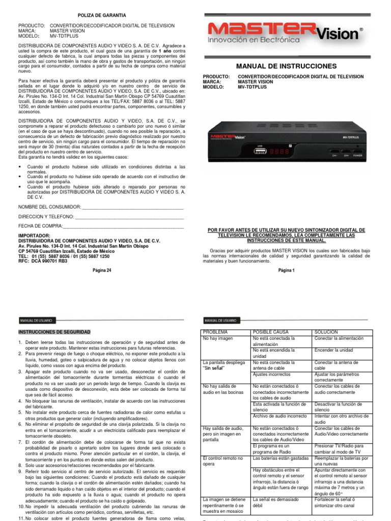 Gracias por adquirir productos MASTER VISION los cuales son fabricados bajo