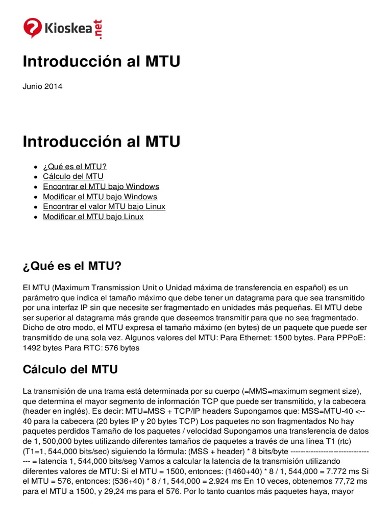 El MTU (Maximum Transmission Unit o Unidad mxima de transferencia en espaol) es un