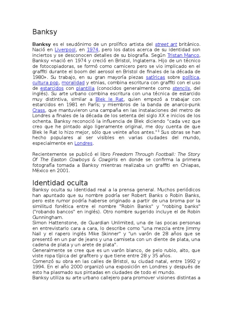 Banksy naci en 1974 y creci en Bristol, Inglaterra. Hijo de un tcnico
