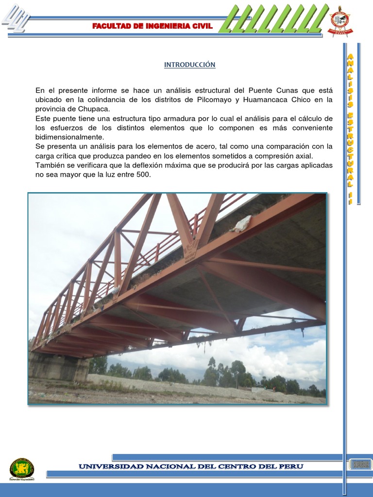En el presente informe se hace un anlisis estructural del Puente Cunas que est
