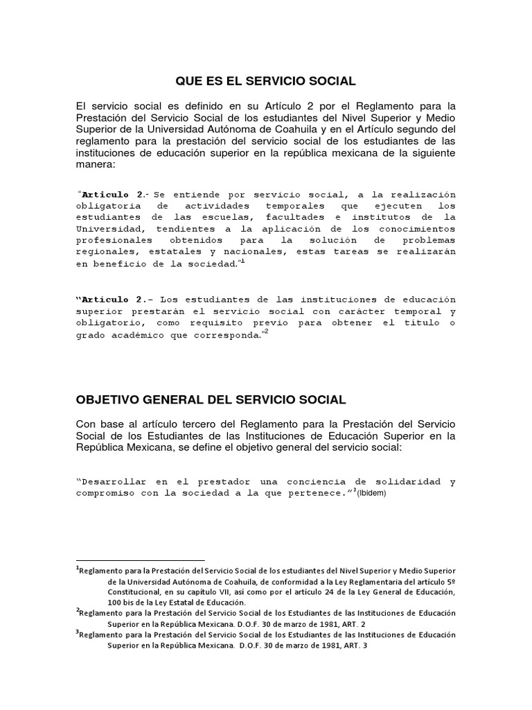 El servicio social es definido en su Artculo 2 por el Reglamento para la