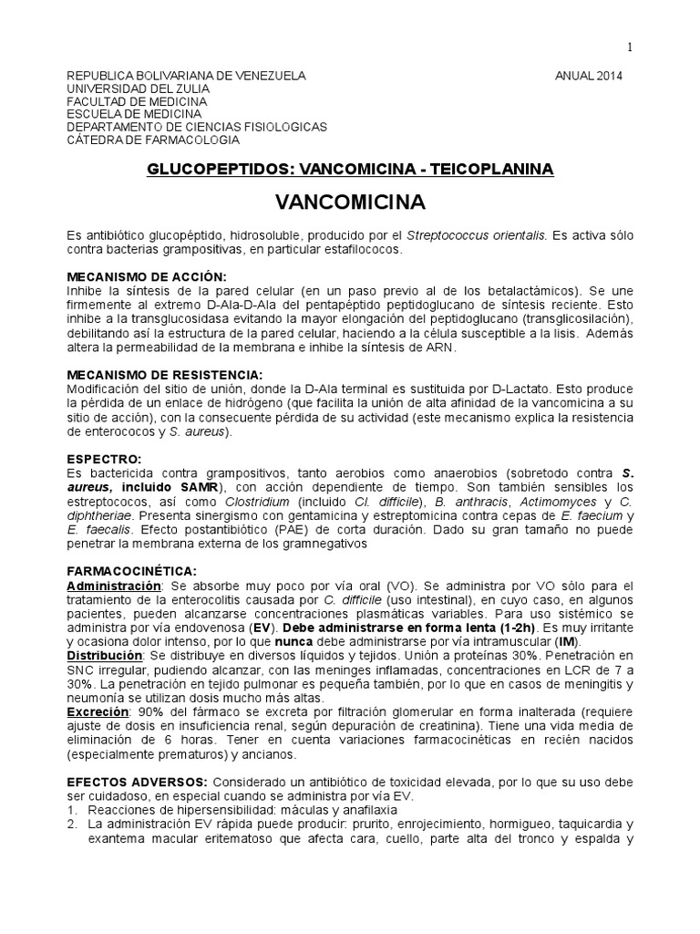 Es antibitico glucopptido, hidrosoluble, producido por el Streptococcus orientalis. Es activa slo