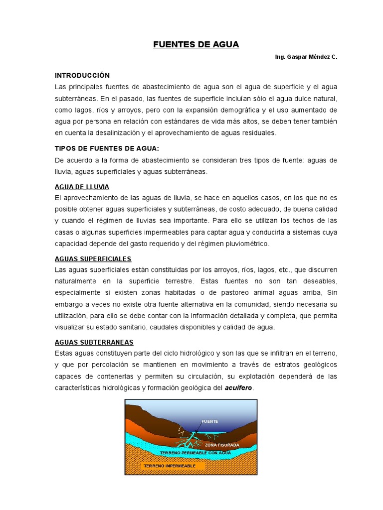 De acuerdo a la forma de abastecimiento se consideran tres tipos de fuente: aguas de