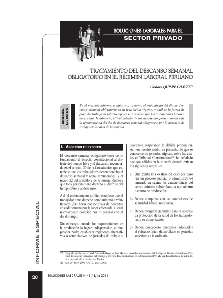 En el presente informe, el autor nos presenta el tratamiento del da de descanso semanal obligatorio en la legislacin vigente, y cul es la forma de