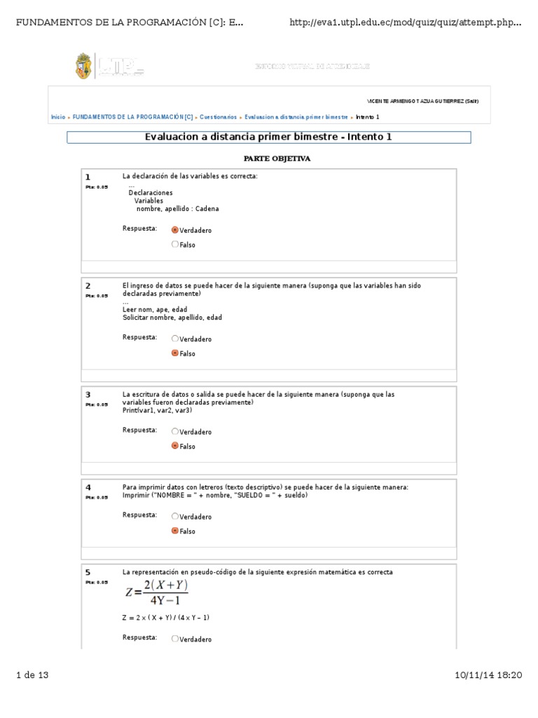 Inicio FUNDAMENTOS DE LA PROGRAMACIN [C] Cuestionarios Evaluacion a distancia primer bimestre Intento 1