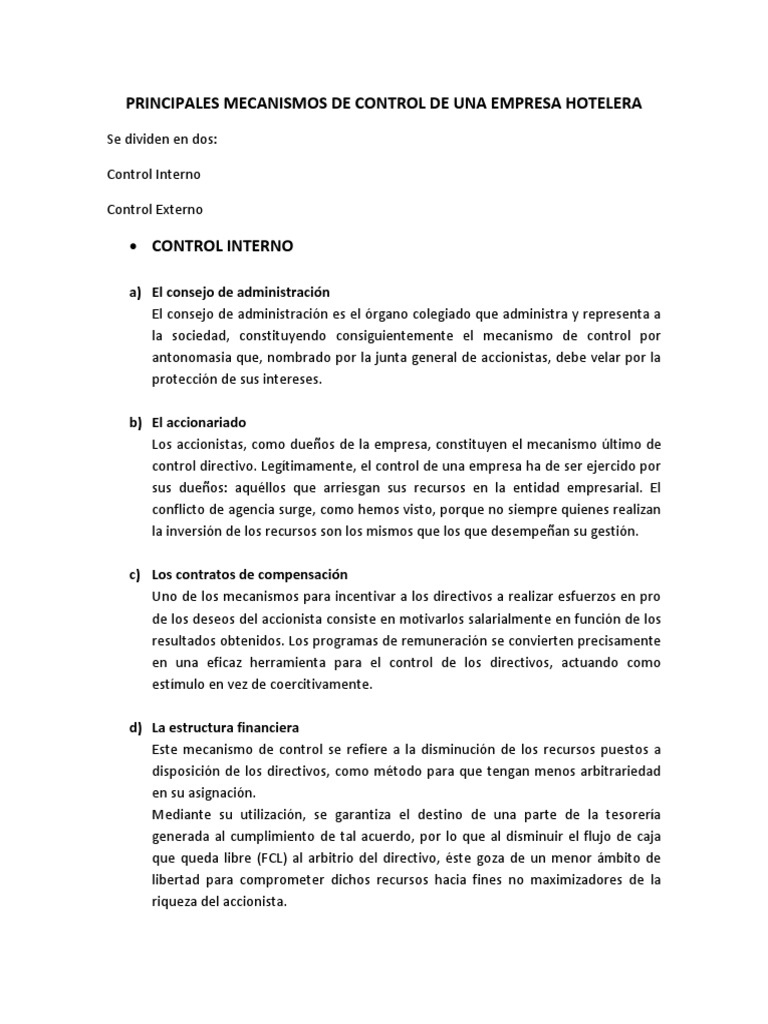 PRINCIPALES MECANISMOS DE CONTROL DE UNA EMPRESA HOTELERA