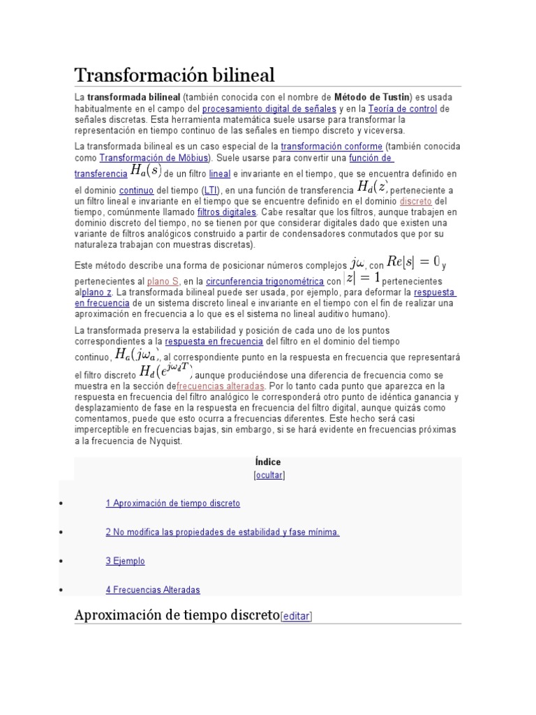 La transformada bilineal (tambin conocida con el nombre de Mtodo de Tustin) es usada