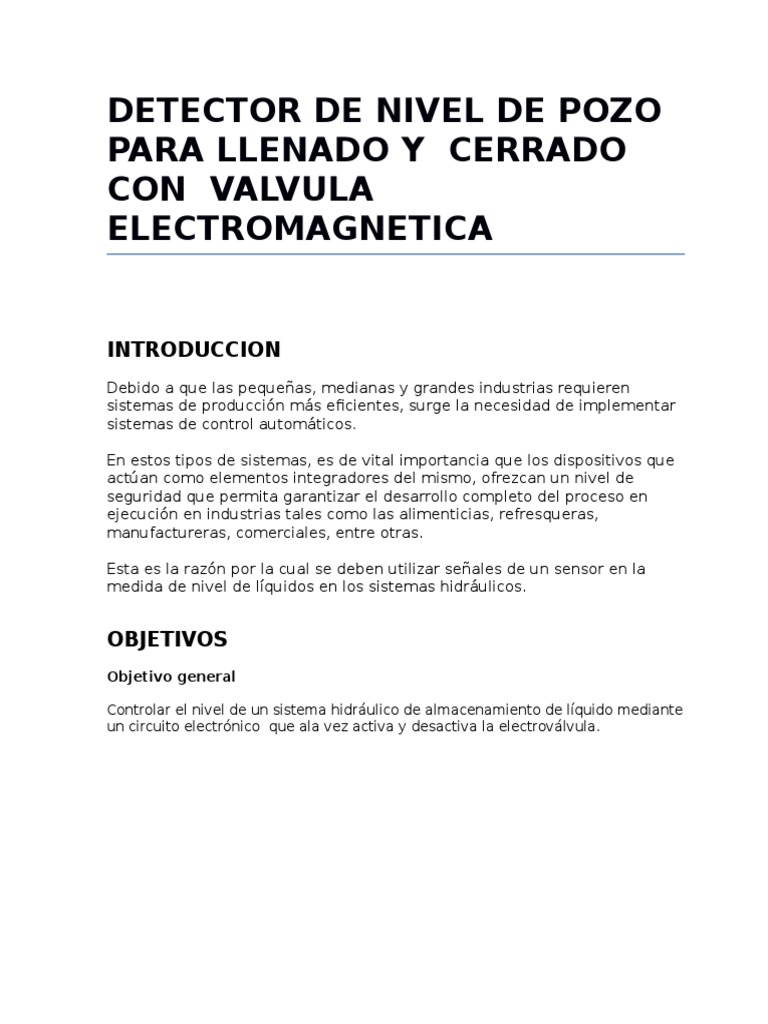 Para el correcto funcionamiento del control de nivel, la valvula se activa cuando el