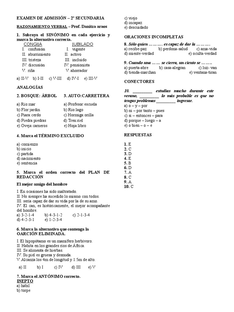 EXAMEN DE ADMISIN 2 SECUNDARIA