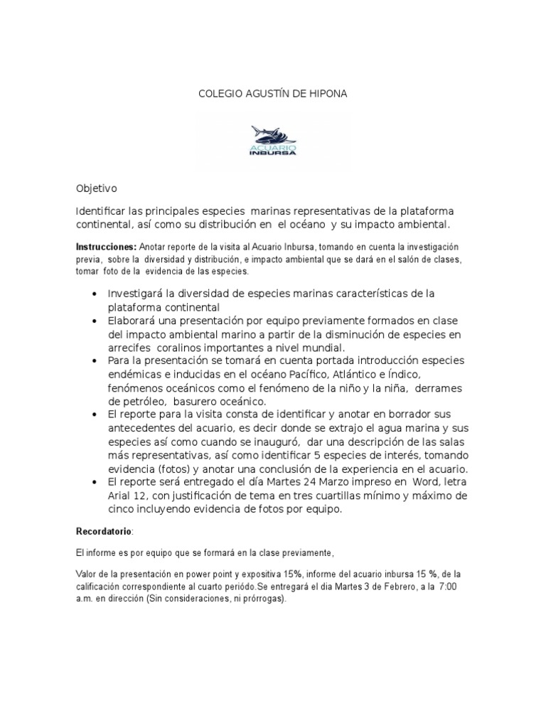 Instrucciones: Anotar reporte de la visita al Acuario Inbursa, tomando en cuenta la investigacin