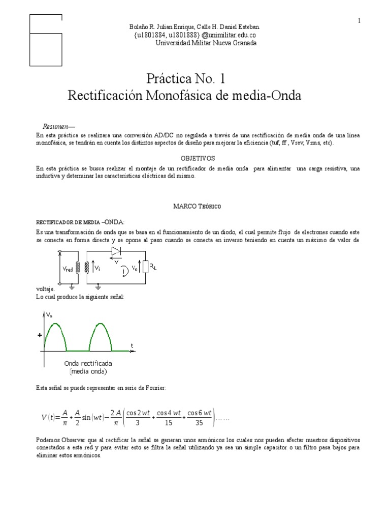 En esta prctica se busca realizar el montaje de un rectificador de media onda para alimentar una carga resistiva, una
