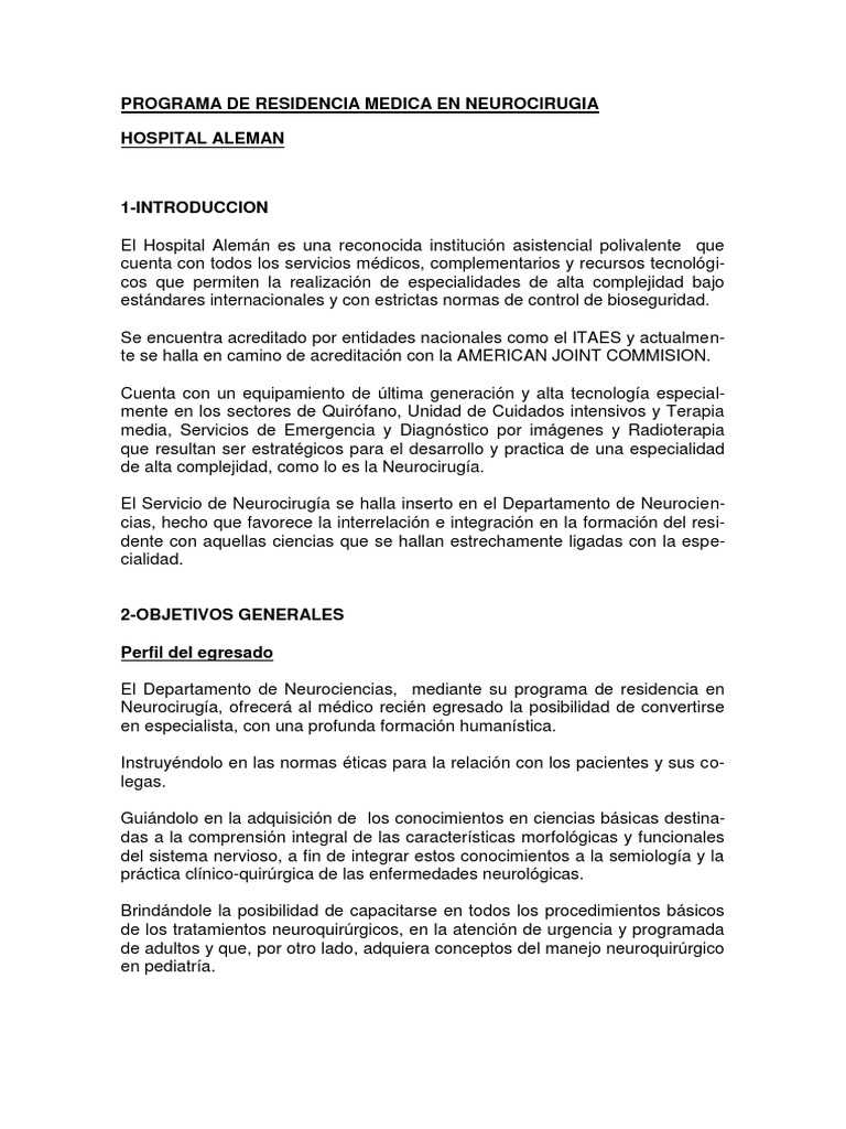 Que atraviese durante su residencia por todas las sub disciplinas de la Neurociruga y que al finalizar adquiera una visin real y moderna de nuestra especialidad.