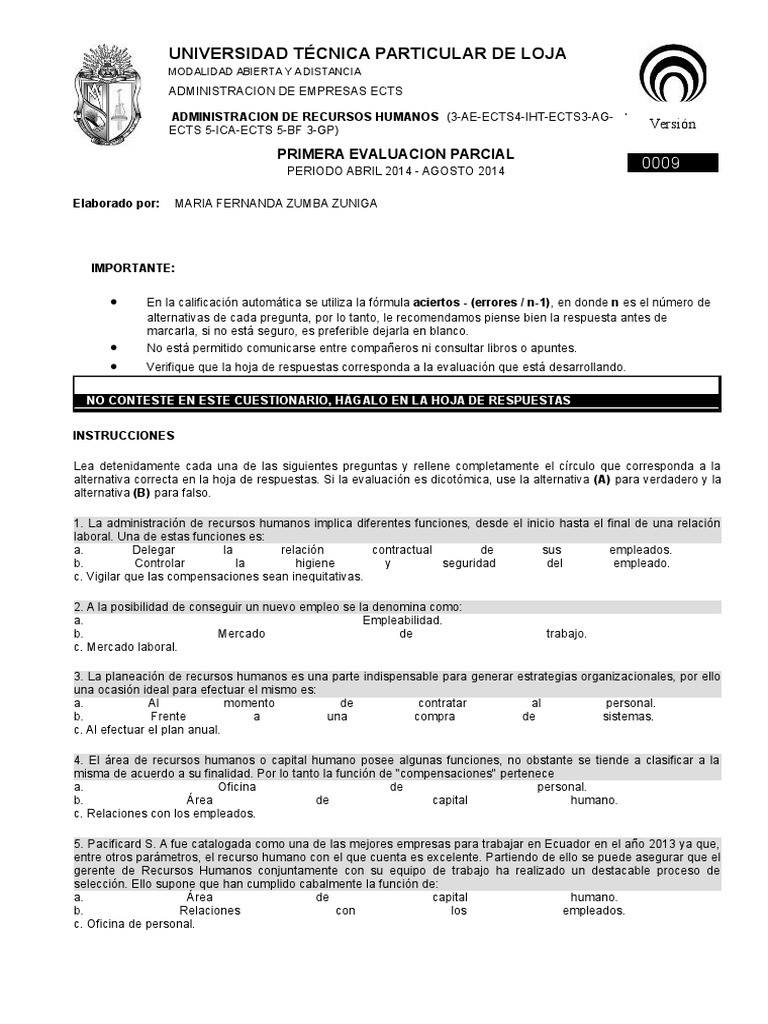 alternativa correcta en la hoja de respuestas. Si la evaluacin es dicotmica, use la alternativa (A) para verdadero y la