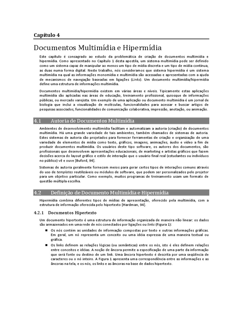 Este capítulo é consagrado ao estudo da problemática de criação de documentos multimídia e hipermídia. Como apresentado no Capítulo 1 desta apostila, um sistema multimídia pode ser definido como um sistema capaz de manipular ao menos um tipo de mídia discreta e um tipo de mídia contínua, as duas numa forma digital. Neste trabalho, nós consideramos que sistema hipermídia é um sistema multimídia na qual as informações monomídia e multimídia são acessadas e apresentadas com a ajuda de mecanismos de navegação baseadas em ligações (Links). Um documento multimídia/hipermídia define uma estrutura de informações multimídia.