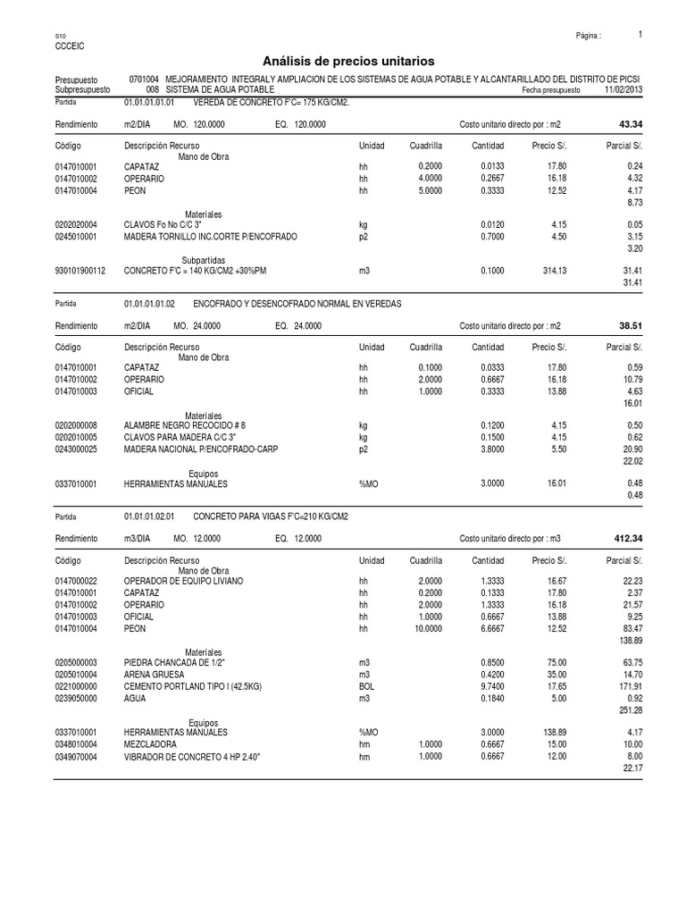 0701004 MEJORAMIENTO INTEGRALY AMPLIACION DE LOS SISTEMAS DE AGUA POTABLE Y ALCANTARILLADO DEL DISTRITO DE PICSI
