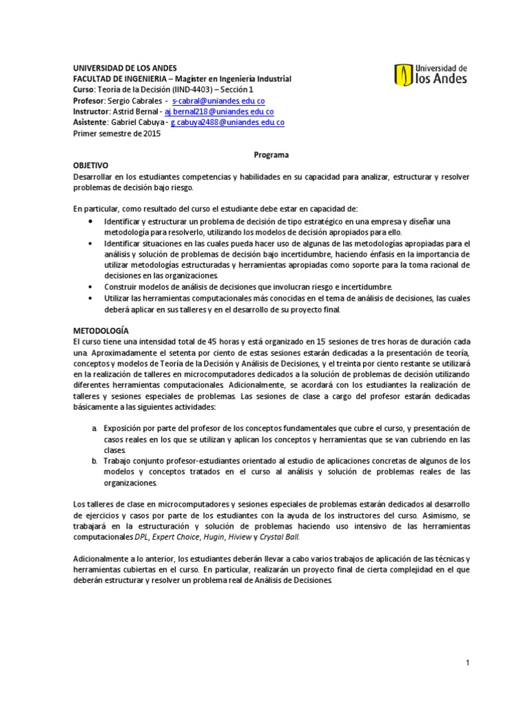 Curso: Teora de la Decisin (IIND-4403) Seccin 1