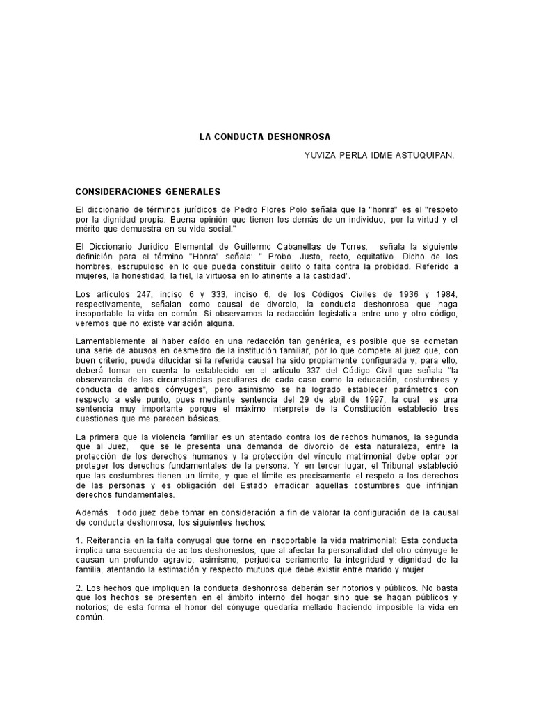 "La conducta deshonrosa significa dirigir sus acciones causando vergenza, y deshonor en la