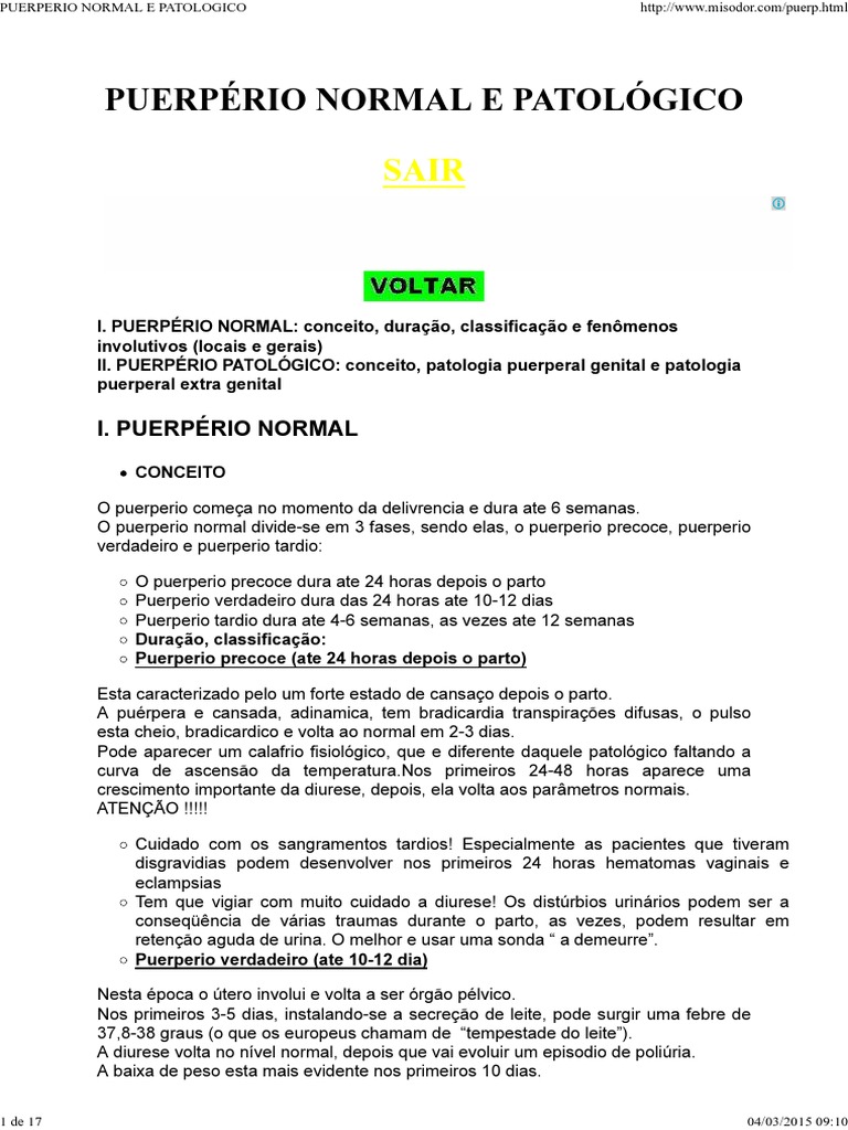 I. PUERPÉRIO NORMAL: conceito, duração, classificação e fenômenos involutivos (locais e gerais) II. PUERPÉRIO PATOLÓGICO: conceito, patologia puerperal genital e patologia puerperal extra genital