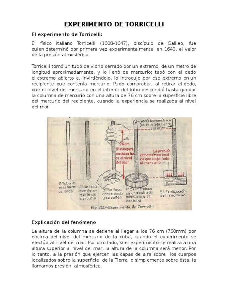 Torricelli estudi la presin atmosfrica. Invirtiendo un tubo de 1 m de