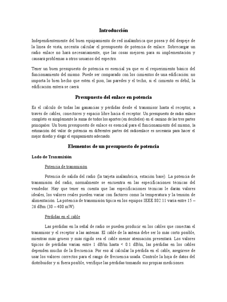 estimacin del valor de potencia en diferentes partes del radioenlace es necesaria para hacer el