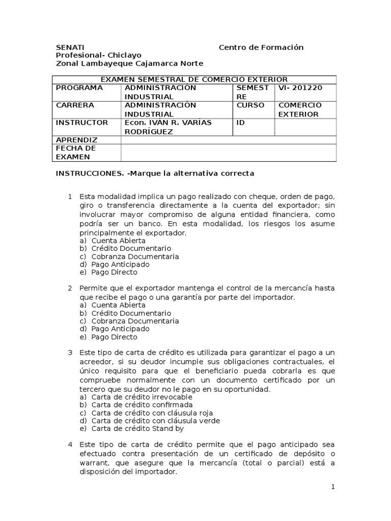 EXAMEN SEMESTRAL DE COMERCIO EXTERIOR