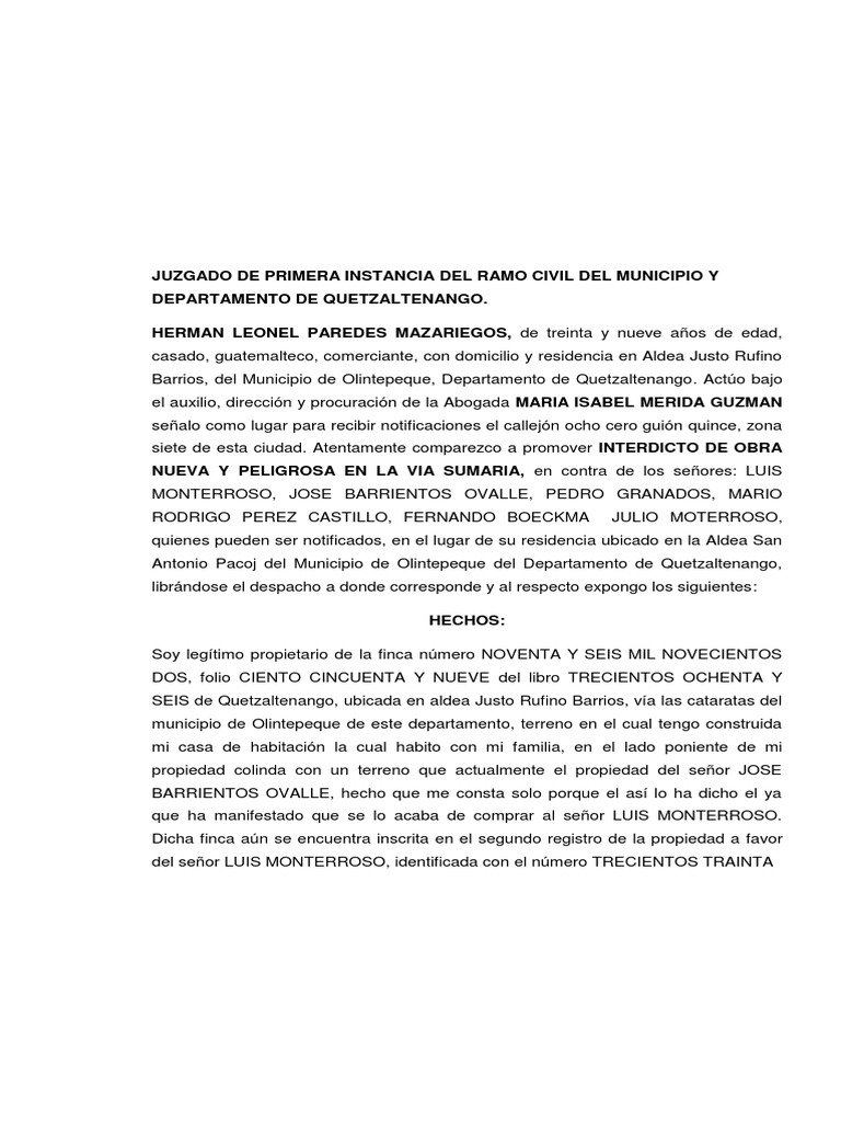 MAZARIEGOS al pretender de la parte demandada la suspensin de la obra que