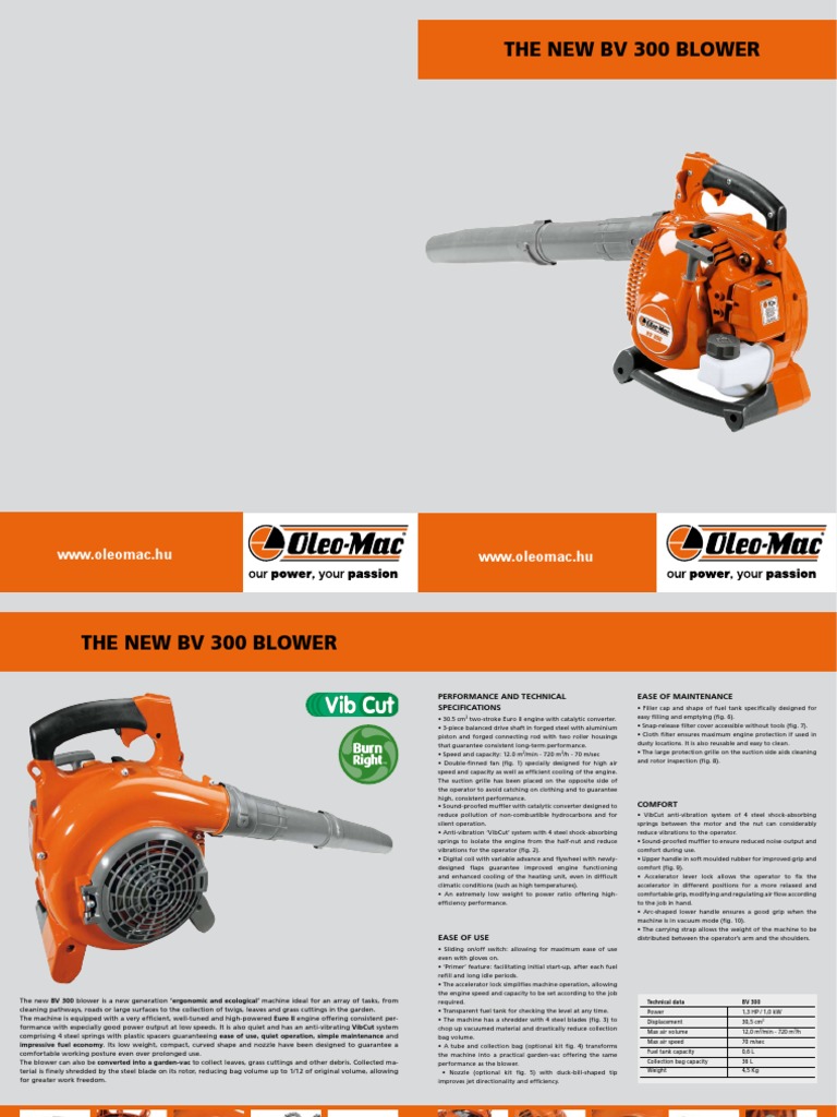 0 m3/min .720 m3/h Max air speed 70 m/sec Fuel tank capacity 0. EASE OF USE The new BV 300 blower is a new generation ‘ergonomic and ecological’ machine ideal for an array of tasks.THE NEW BV 300 BLOWER PERFORMANCE AND TECHNICAL SPECIFICATIONS EASE OF MAINTENANCE • 30.70 m/sec • Double-finned fan (fig. leaves and grass cuttings in the garden. • Digital coil with variable advance and flywheel with newlydesigned flaps guarantee improved engine functioning and enhanced cooling of the heating unit. allowing the engine speed and capacity to be set according to the job required. • A tube and collection bag (optional kit fig. Its low weight. 6 7 8 • Filler cap and shape of fuel tank specifically designed for easy filling and emptying (fig. consistent performance. 4) transforms the machine into a practical garden-vac offering the same performance as the blower.5 cm3 two-stroke Euro II engine with catalytic converter. • The accelerator lock simplifies machine operation. Technical data BV 300 Power 1.0 m3/min . allowing for greater work freedom. 10). compact. 6). • Accelerator lever lock allows the operator to fix the accelerator in different positions for a more relaxed and comfortable grip. The blower can also be converted into a garden-vac to collect leaves. 1 2 3 4 5 • Sliding on/off switch: allowing for maximum ease of use even with gloves on. • Sound-proofed muffler with catalytic converter designed to reduce pollution of non-combustible hydrocarbons and for silent operation. • Sound-proofed muffler to ensure reduced noise output and comfort during use. roads or large surfaces to the collection of twigs. well-tuned and high-powered Euro II engine offering consistent performance with especially good power output at low speeds. 9).3 HP / 1. reducing bag volume up to 1/12 of original volume. • Snap-release filter cover accessible without tools (fig. from cleaning pathways.5 cm3 Max air volume 12. even in difficult climatic conditions (such as high temperatures). 3) to chop up vacuumed material and drastically reduce collection bag volume. • The large protection grille on the suction side aids cleaning and rotor inspection (fig. 7). 5) with duck-bill-shaped tip improves jet directionality and efficiency. • Transparent fuel tank for checking the level at any time. simple maintenance and impressive fuel economy. curved shape and nozzle have been designed to guarantee a comfortable working posture even over prolonged use. 8).6 L Collection bag capacity 36 L Weight 4. The machine is equipped with a very efficient. The suction grille has been placed on the opposite side of the operator to avoid catching on clothing and to guarantee high. quiet operation. • 3-piece balanced drive shaft in forged steel with aluminium piston and forged connecting rod with two roller housings that guarantee consistent long-term performance. after each fuel refill and long idle periods. 2). • The machine has a shredder with 4 steel blades (fig. It is also reusable and easy to clean. • Arc-shaped lower handle ensures a good grip when the machine is in vacuum mode (fig. • Anti-vibration ‘VibCut’ system with 4 steel shock-absorbing springs to isolate the engine from the half-nut and reduce vibrations for the operator (fig.5 Kg 9 10 .720 m3/h . It is also quiet and has an anti-vibrating VibCut system comprising 4 steel springs with plastic spacers guaranteeing ease of use. • Upper handle in soft moulded rubber for improved grip and comfort (fig. • Cloth filter ensures maximum engine protection if used in dusty locations. Collected material is finely shredded by the steel blade on its rotor. 1) specially designed for high air speed and capacity as well as efficient cooling of the engine. • ‘Primer’ feature: facilitating initial start-up. • An extremely low weight to power ratio offering highefficiency performance. • The carrying strap allows the weight of the machine to be distributed between the operator’s arm and the shoulders.0 kW Displacement 30. grass cuttings and other debris. COMFORT • VibCut anti-vibration system of 4 steel shock-absorbing springs between the motor and the nut can considerably reduce vibrations to the operator. • Speed and capacity: 12. modifying and regulating air flow according to the job in hand. • Nozzle (optional kit fig.