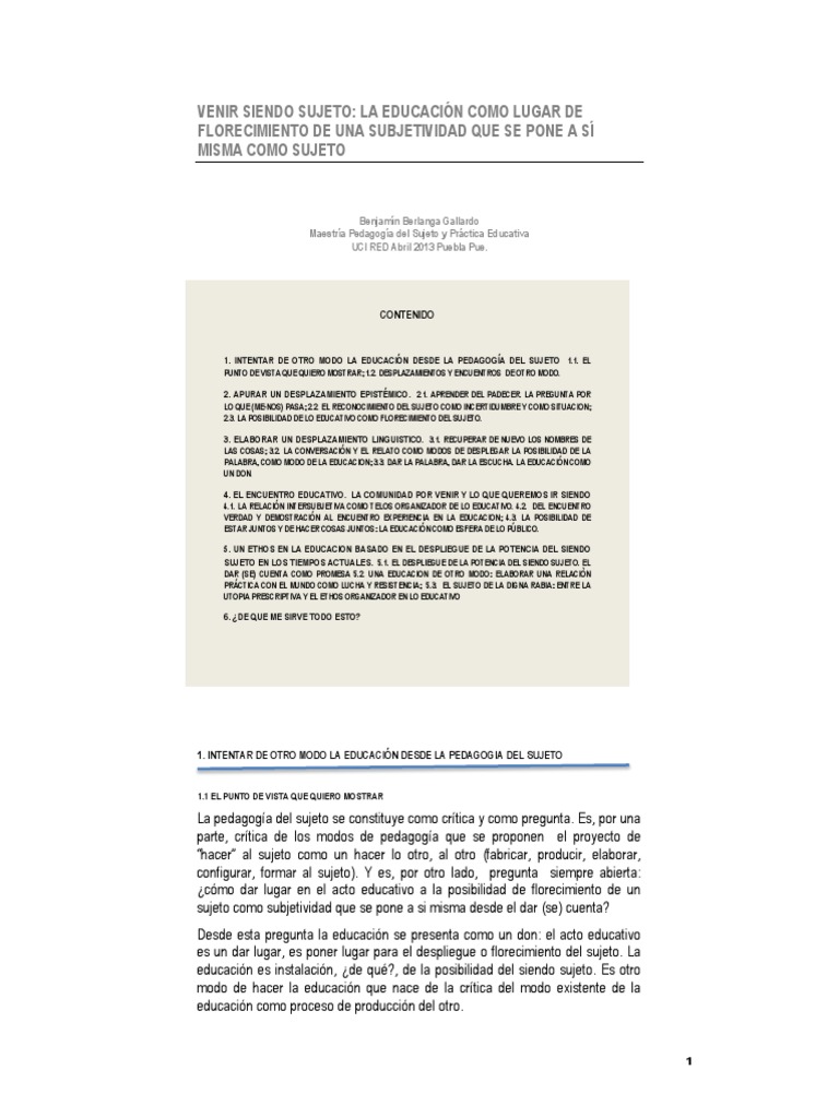 1. INTENTAR DE OTRO MODO LA EDUCACIN DESDE LA PEDAGOGIA DEL SUJETO