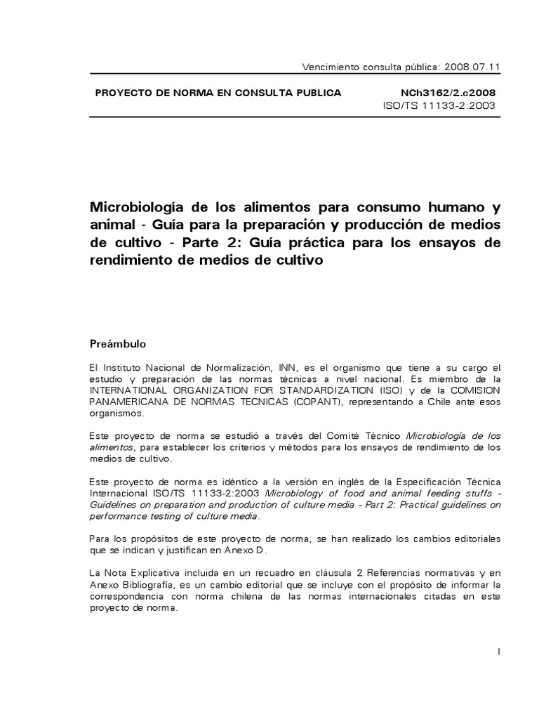 Internacional ISO/TS 11133-2:2003 Microbiology of food and animal feeding stuffs Guidelines on preparation and production of culture media - Part 2: Practical guidelines on