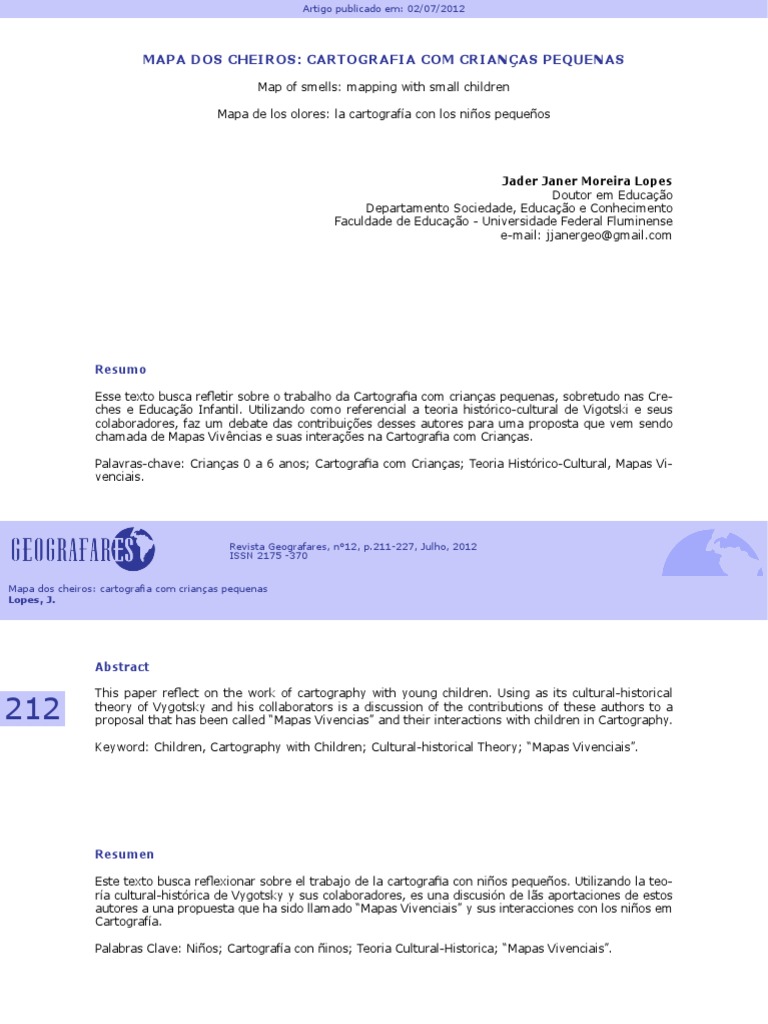 Palabras Clave: Nios; Cartografa con inos; Teoria Cultural-Historica; Mapas Vivenciais.